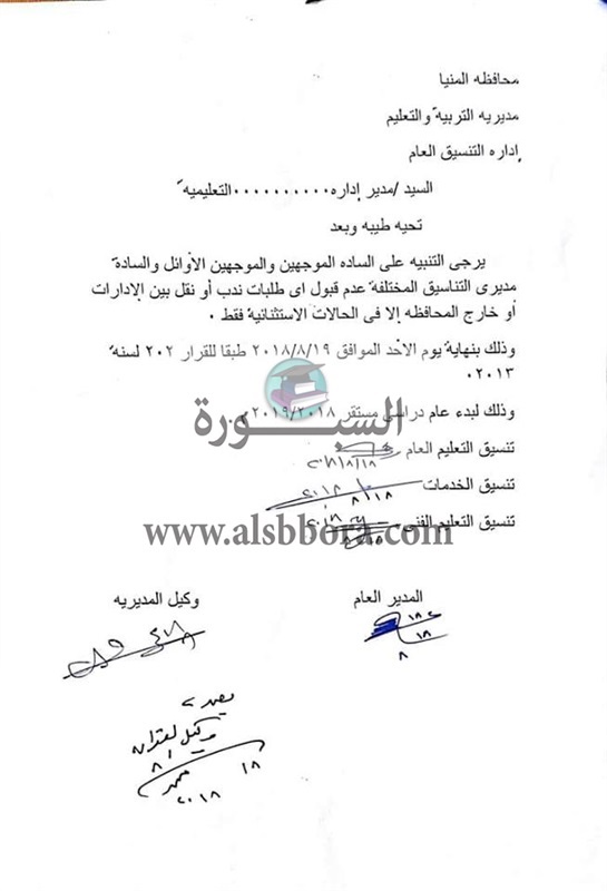 وقامت المديرية بإرسال خطابا الى جميع الادارات تعلن فيه ان آخر فرصة غدا ويرجى التنبيه على الموجهين والموجهين الأوائل ومديرى التناسيق المختلفة عدم قبول اى طلبات ندب أو نقل بين الادارات أو خارج المحافظة الا فى الحالات الاستثنائية فقط، وذلك بنهاية يوم الأحد الموافق 19 أغسطس طبقا للقرار 202 لسنة 2013، وذلك لبدء عام دراسى مستقر 2019/2018.