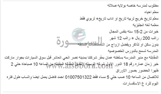 تعلن مدارس صلاله العمانية عن وظائف جديدة للمعلمين والمعلمات وذلك وفقا لنص الإعلان التالي:-