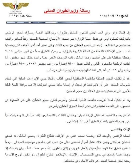 أعلن الفريق يونس المصري، وزير الطيران المدني، تطبيق خطة مستقبلية اعتبارا من سبتمبر المقبل، يتم على أساسها زيادة أجور العاملين أصحاب الدرجات الأدنى دفعة واحدة، أما الفئات الوظيفية بالمستوى الثاني والثالث سيتم الزيادة بنسبة 50% اعتبارا من راتب سبتمبر للعام الجاري، و50 % يوليو للعام المقبل، أما باقي الفئات الوظيفية سيتم زيادتها على مراحل، أي بنسبة 100% بعد عام.
