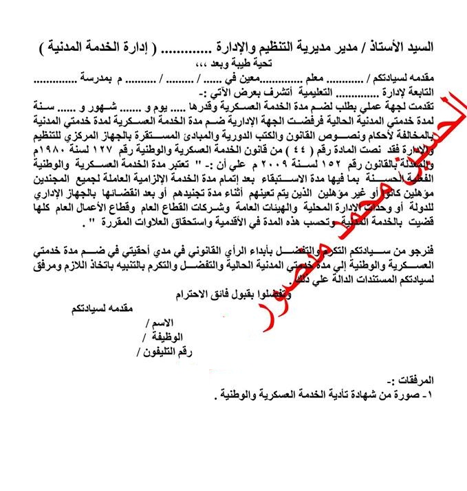 ننشر طلب ضم مدة الخدمة العسكرية المقدم الى التنظيم والادارة حال رفض الادارة