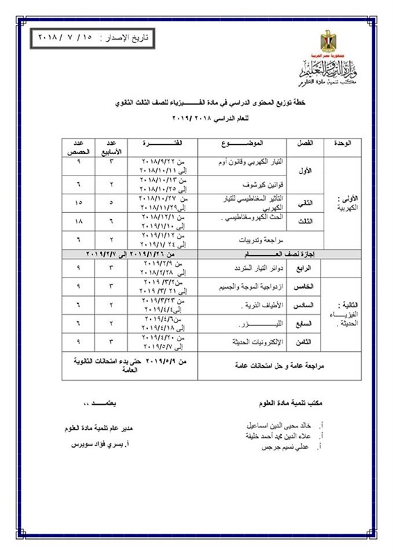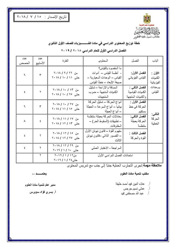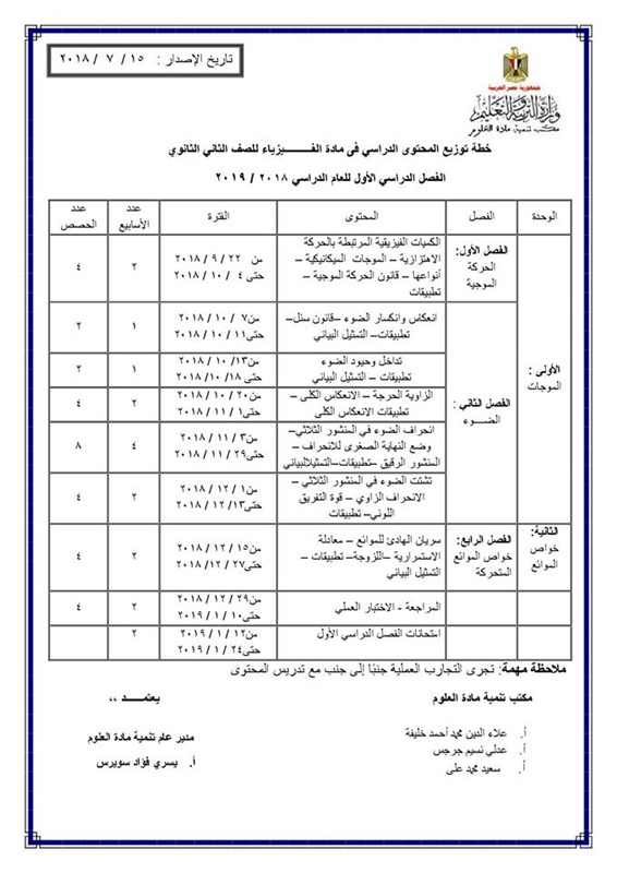 تنشر " السبورة " لطلاب ومعلمى العلوم للمرحلة الثانوية ، توزيع منهج الفيزياء للصف الأول والثاني والثالث الثانوي الفصل الدراسي الاول للعام 2018 / 2019