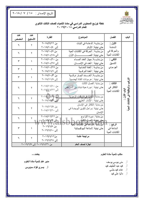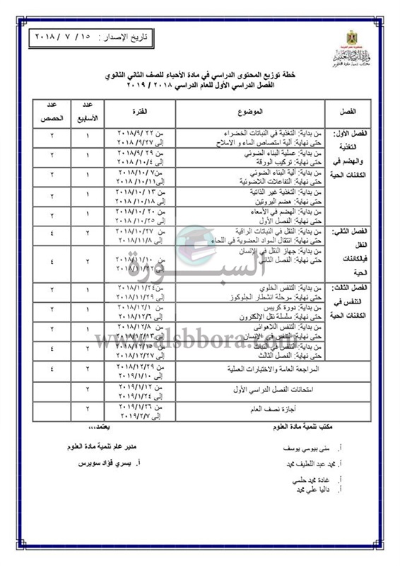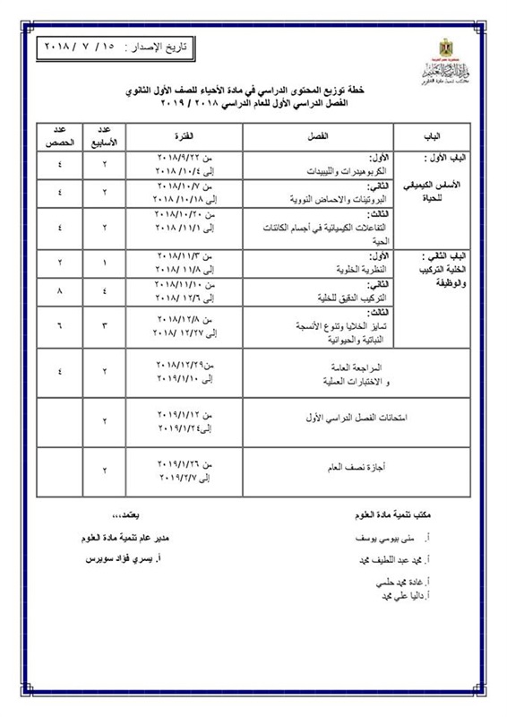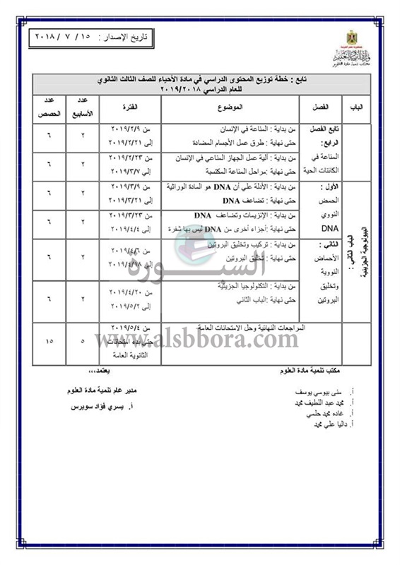 توزيع منهج الاحياء للصف الاولى والثانى والثالث الثانوى 2018 / 2019