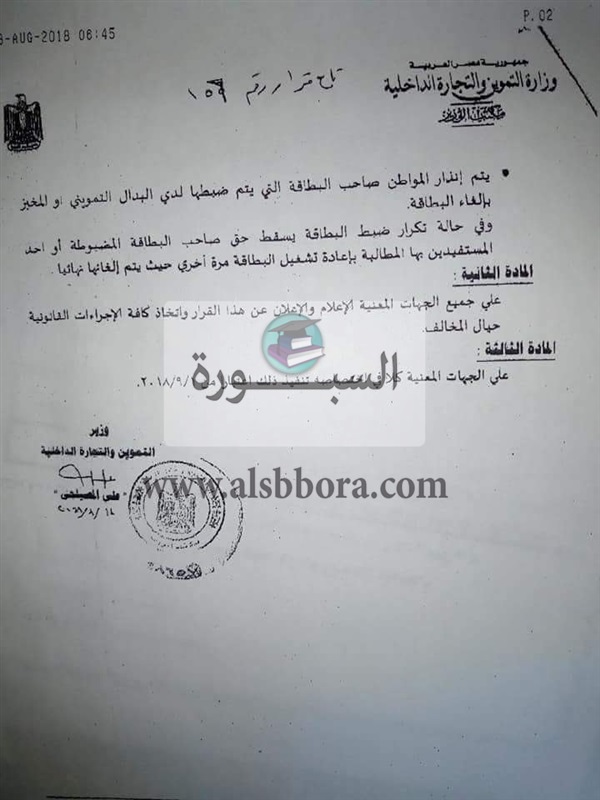 تنشر "السبورة" قرار وزارة التموين والذي تضمن أنه الخاص بسقوط حق صاحب بطاقة التموين والخبز المضبوطة ويتم إلغائها نهائيا وبدء التطبيق 1 سبمبر المقبل.