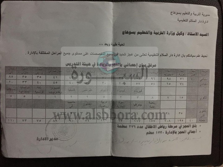التربية والتعليم بسوهاج وجود عجز في مراحل التعليم الثلاثة المختلفة حيث إنه تم تعيين