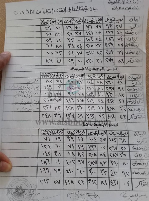أصدرت إدارة قنا التعليمية لابدل النقدي الجديد لإدارة قنا التعليمية اعتبارا من 7-7-2018 م ويتم تحرير الفروق المالية عن المدة من 7-7-2018 م حتي 31-8-2018م والموضحة بالعمود الاخير من كل جدول .