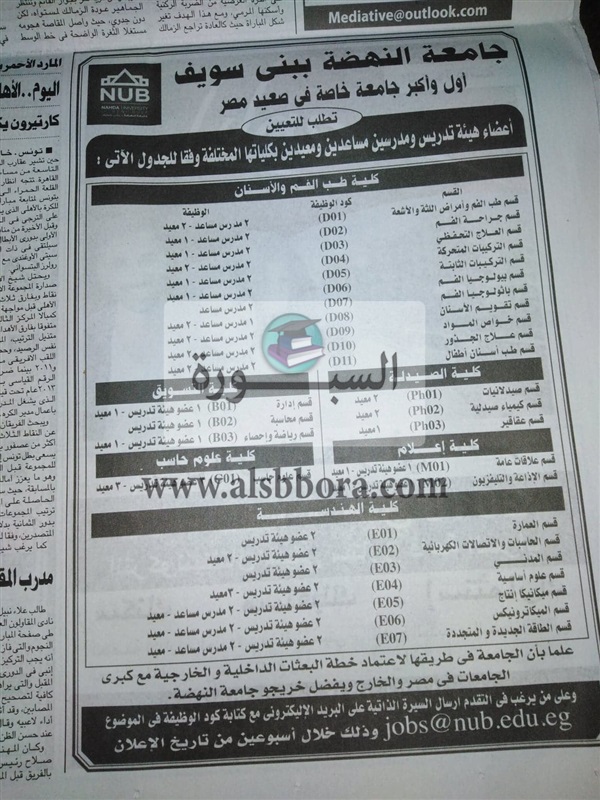 تعلن جامعة النهضة عن حاجتها الى اعضاء هيئة التدريس "من المعيد الى أستاذ" فى 6 كليات وذلك وفقا لنص الاعلان التالي: