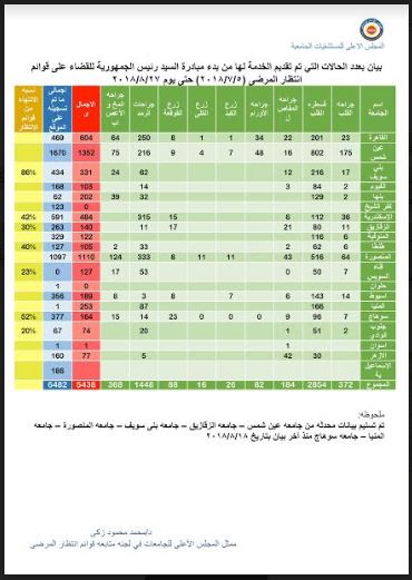أعلن الدكتور منصور حسن رئيس جامعة بني سويف عن احتلال الجامعة المركز الأول في القضاء على قوائم انتظار المرضى بنسبة وصلت إلى (86%) طبقا لبيان المجلس الأعلى للمستشفيات الجامعية.