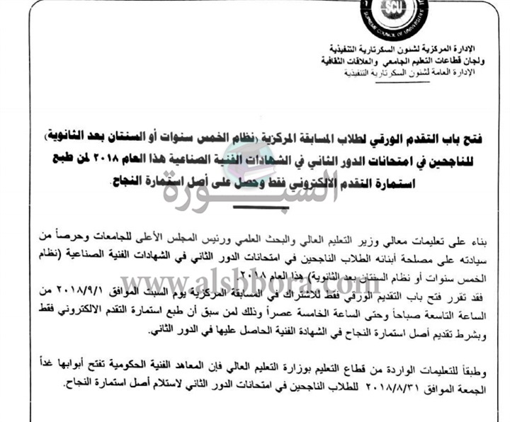 أعلنت وزارة التعليم العالي عن فتح باب التقدم الورقي لطلاب المسابقة المركزية (نظام الخمس سنوات أو السنتان بعد الثانوية) للناجحين في امتحانات الدورالثاني في الشهادات الفنية الصناعية