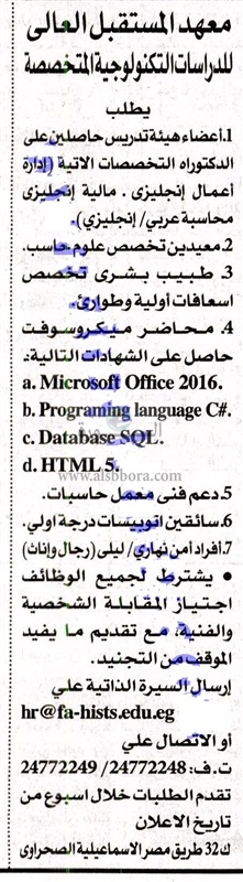 يعلن معهد المستقبل العالى للدراسات التكنولوجية المتخصصة عن حاجته الى اعضاء هيئة التدريس، وعلى الراغبين فى التقدم ارسال السيرة الذاتية على الايميل عبر الاعلان المنشور فى جريدة الاهرام.