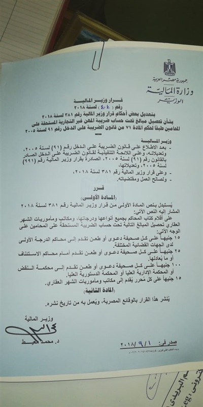 اصدر الدكتور محمد معيط وزير المالية قرارا وزاريا بشأن تحصيل مبالغ تحت حساب ضريبة المهن غير التجارية المستحقة على المحامين طبقاً لحكم المادة 71 من قانون الضريبة على الدخل رقم 91 لسنة 2005.
