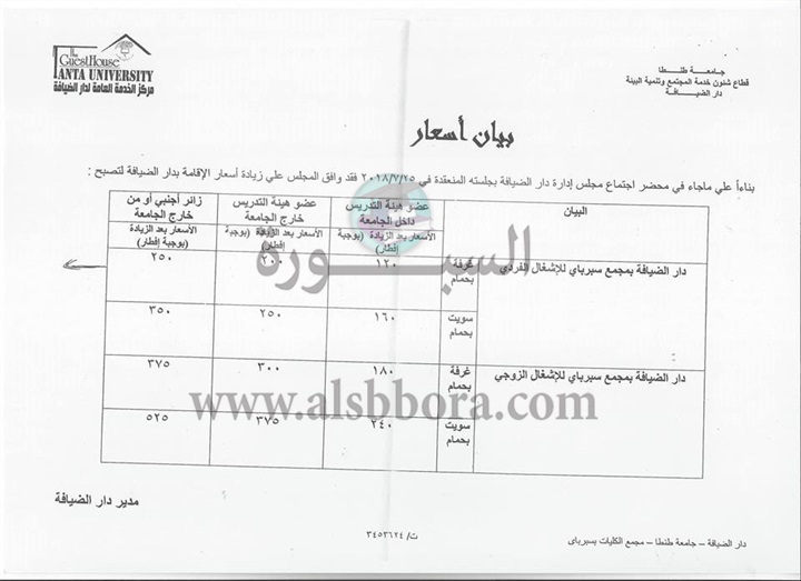 تضرر عدد من اعضاء هيئة التدريس المقيمين فى دار الضيافة في مجمع سبرباي من داخل جامعة طنطا وخارجها من زيادة الأسعار بنسبة 300% عن الأسعار السابقة والتى تم اعتمادها من مجلس ادارة الضيافة والتى تم عقدها يوم 25 يوليو الماضى، وينشر موقع السبورة قائمة بالاسعار الجديدة، والتى جاءت كالتالى: