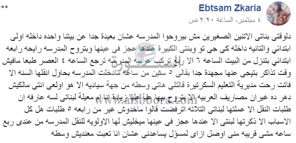 وجهت وليه أمر وأم لتلميذتين بالمدرسة رسالة استغاثة للدكتور طارق شوقي وزير التربية والتعليم قالت فيها "بناتي في خطر بسبب المدرسة وماعنديش واسطه علشان انقذهم"