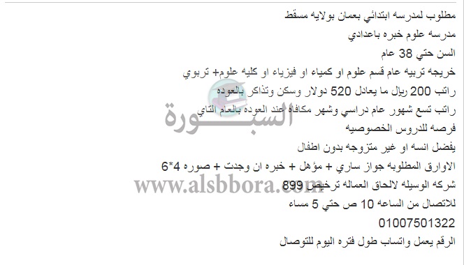 تعلن مدرسة خاصة في سلطنة عمان عن وظائف جديدة للمعلمين والمعلمات بمرتبات تصل إلي 9 ألاف جنيها وذلك وفقا لنص الإعلان التالي:-