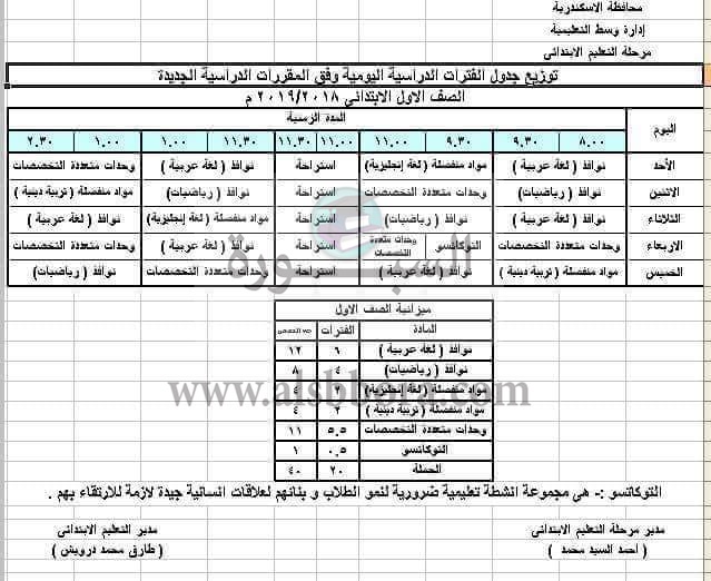 ينشر موقع السبورة توزيع جدول الفترات الدراسية وفق المقررات الدارسية الجديدة للصف الأول الابتدائى 2019/2018 لمحافظة الاسكندرية