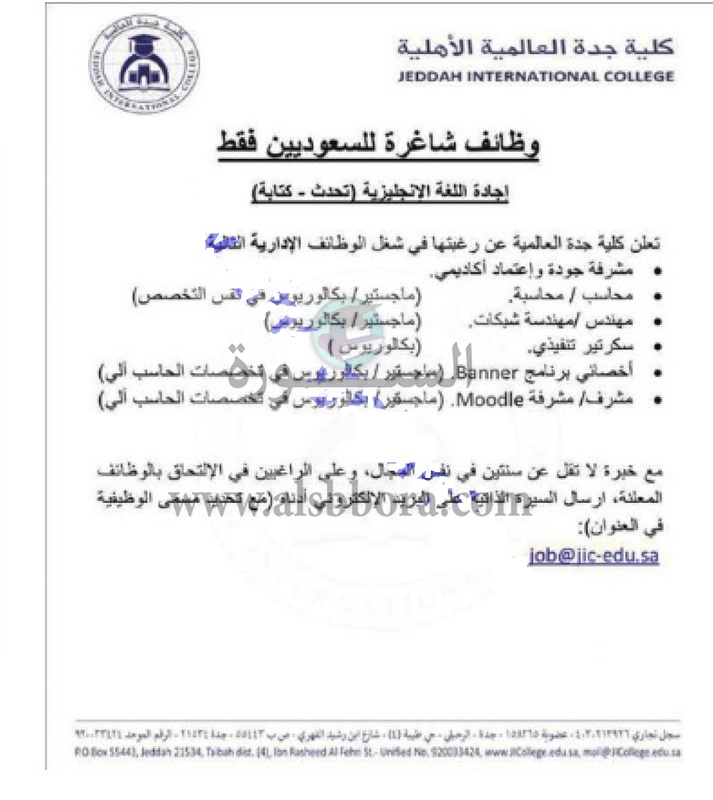 تعلن كلية جدة العالمية الأهلية بالمملكة العربية السعودية عن حاجتها الى اعضاء هيئة التدريس، وعلى الراغبين فى التقدم ارسال السيرة الذاتية على البريد الاكترونى المنشور فى الاعلان التالى: