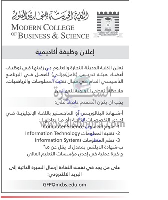أعلنت الكلية الحديثة للتجارة والعلوم بسلطنة عمان عن حاجتها الى اعضاء هيئة التدريس، وعلى الراغبين فى التقدم ارسال السيرة الذاتية عبر الايميل المنشور فى الاعلان التالى: