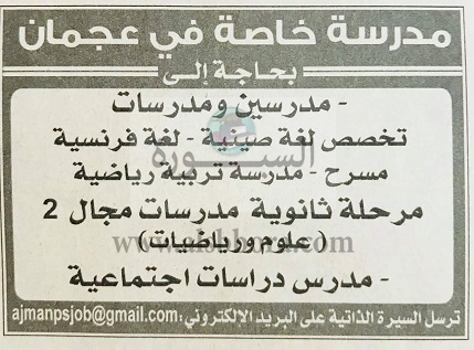 تعلن مدارس عجمان الإماراتية عن وظائف جديدة للمعلمين والمعلمات في جميع المواد وذلك وفقا لنص الإعلان التالي: