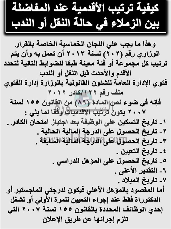 كشفت وزارة التربية والتعليم 7 شروط لا بد من توافرها عند نقل او ندب المعلمين وكيفية ترتيب الأقدمية عند المفاضلة بين الزملاء، طبقا لنص المادة 89 من قانون 155 لسنة 2007 على ان يكون ترتيب الأقدمية كما يلى: