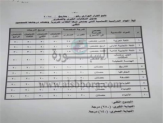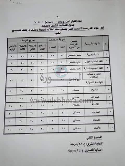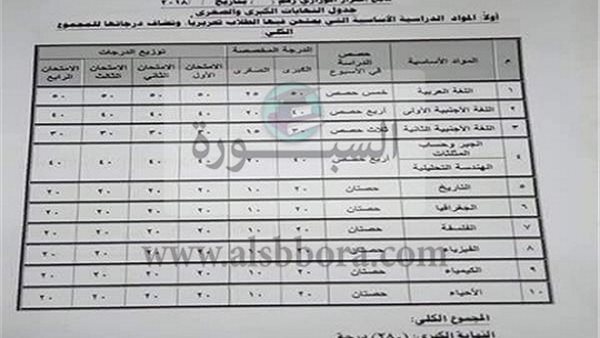 ننشرعدد الحصص وجدول درجات المواد الأساسية المقرر تطبيقه على طلاب الثانوية التراكمية