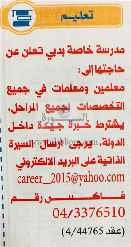 تعلن مدرسة خاصة في الإمارات عن وظائف جديدة للمعلمين والمعلمات في جميع المواد وذلك وفقا لنص الإعلان التالي: