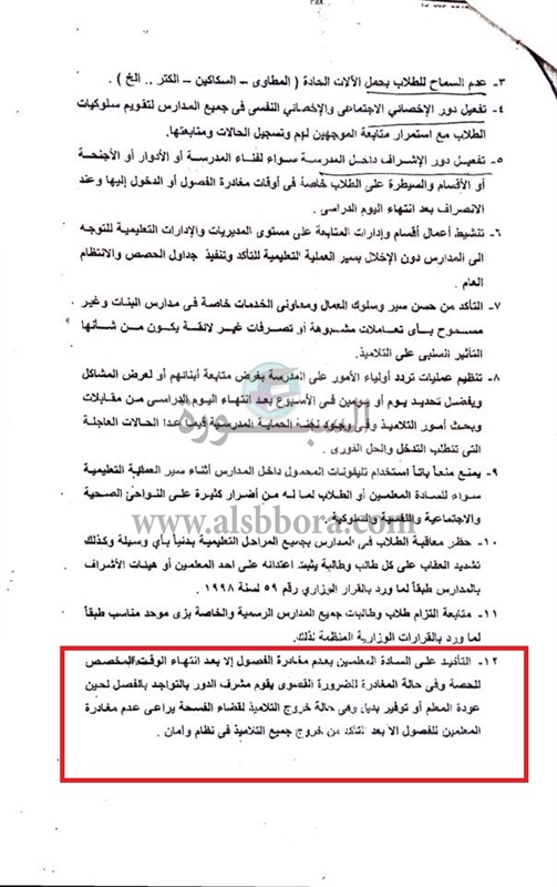 أكدت وزارة التربية والتعليم والتعليم الفنى، على عدم مغادرة المعلمين الفصول الا بعد انتهاء الوقت المخصص للحصة وفى حالة المعادرة للضرورة القصوى يقوم مشبف الدور بالتواجد بالفصل لحية عودة المعلم او توفير بديل وهى حالة خرود التلاميذ لقضاء الفسحة ويراعى عدم مغادرة المعلمين للفصول الا بعد التأكد من خروج جميع التلاميذ فى نظام وأمان.