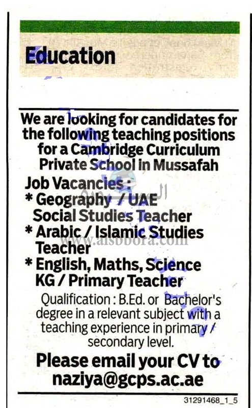 تعلن كبرى المدارس بدولة الامارات العربية الشيقية عن حاجتها الى معلمين ومعلمات، وعلى الراغبين فى الحصول على الوظيفة ارسال السيرة الذاتية على الايميل المنشور فى الاعلان التالى: