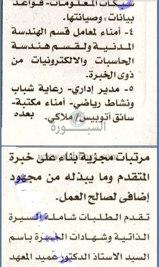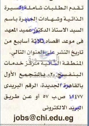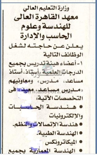 تعلن وزارة التعليم العالى عن حاجة معهد القاهرة العالى للهندسة وعلوم الحاسب والادارة عن حاجته الى اعضاء هيئة التدريس فى جميع الدرجات العلمية (استاذ واستاذ مساعد ومدرس ومعاونيهم "مدرس مساعد ومعيد") فى 12 تخصصا بالاضافة الى مدربين ومصممين وامناء معامل، وعلى الراغبين فى التقدم ارسال السيرة الذاتية عبر الايميل المنشور فى اعلان جريدة اخبار اليوم "السبت" الموافق 21 سبتمبر 2018، فى موعد اقصاه 3 اسابيع من تاريخ النشر ([email protected]).