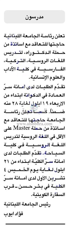 تعلن الجامعة اللبنانية عن وظائف جديدة لأعضاء هيئة التدريس "من معيد إلي أستاذ" وذلك وفقا لنص الإعلان التالي: