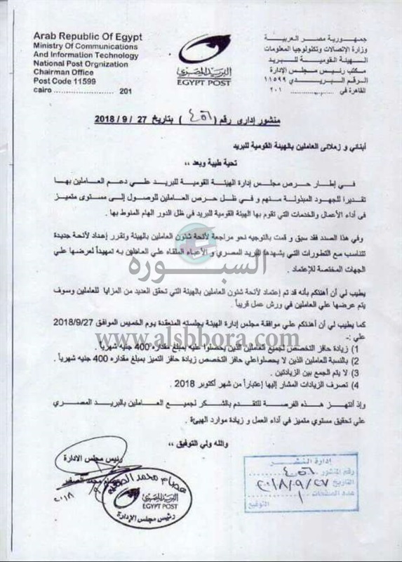 وتصرف الزيادة المشار إليها اعتبارًا من شهر أكتوبر المقبل، وذلك إطار حرص مجلس إدارة البريد، على دعم العاملين بالهيئة، تقديرًا للجهود المبذولة منهم في ظل حرص العاملين للوصول إلى مستوى متميز في أداء الأعمال والخدمات التي تقوم بها الهيئة، في ظل الدور الهام المنوط بها.