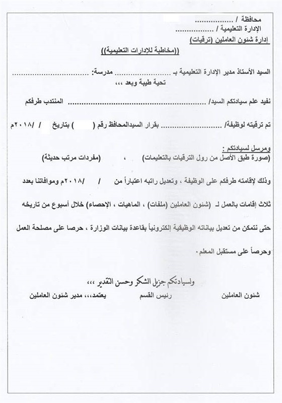 "أما للمعلمين المنتدبين لمدارس أخرى وصدر لهم قرار المحافظ بالترقى لوظيفة أعلى، فيجب عليهم ملء النموذج من جهتهم الأصلية وإرفاق المرفقات الموضحة وتسليمهم للجهة المنتدبين إليها لاقامتهم وتعديل راتبهم وموافاة أقسام الإحصاء بالإقامة بالعمل لتعديل الوظيفة إلكترونياً وننشر لكم النموذج المرفق لطباعته وتقديمه في حال طلبه من الإدارة الخاصة بك".