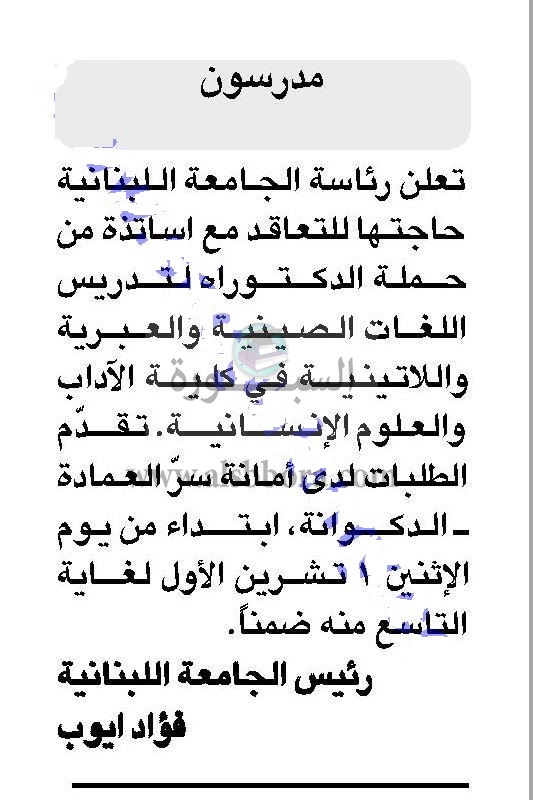 تعلن رئاسة الجامعة اللبنانية عن حاجتها للتعاقد مع اساتذة من حملة الدكتوراة لتدريس اللغات الصينية والعبرية واللاتينية فى كلية الآداب والعلوم الانسانية، وعلى الراغبين فى الحصول على الوظيفة تقديم الطلبات لدى امانة سر العمادة الدكوانة ابتداء من أول اكتوبر حتى التاسع منه.
