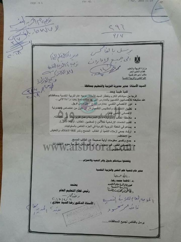 ارسل قطاع التعليم العام بوزارة التربية والتعليم والتعليم الفنى فاكسا الى جميع المديريات والادارات التعليمية بشأن موجه عام التربية النفسية بالمديرية، بحيث يجب عليه مراعاة الأتى: