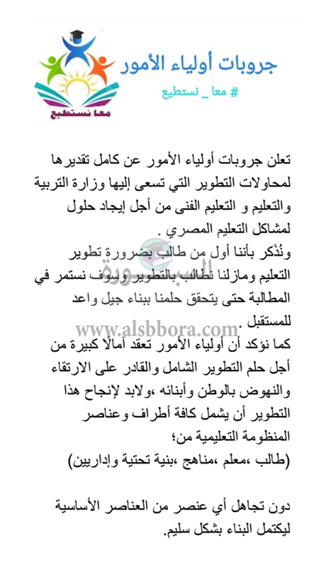 أعلنت جروبات أولياء الأمور عن كامل تقديرها لمحاولات التطوير التي تسعى إليها وزارة التربية والتعليم و التعليم الفنى من أجل إيجاد حلول لمشاكل التعليم المصري .