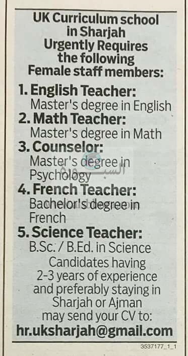 بمرتبات متميزة| مدارس الشارقة الإماراتية تعلن عن وظائف جديدة للمعلمين والمعلمات.. ننشر نص الإعلان