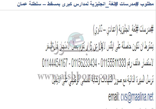 تعلن مدرسة خاصة في سلطنة عمان عن وظائف جديدة للمعلمين والمعلمات المصريين وذلك وفقا لنص الإعلان التالي: