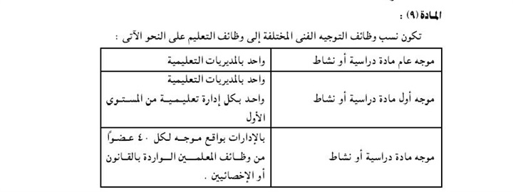 أفاد الحسين محمد منصور الجعفرى الناشط التعليمى ان لكل موجه عدد 40 عضوا من وظائف المعلمين أو الاخصائيين الواردة بالقانون طبقا لصريح نص المادة رقم 9 من اللائحة التنفيذية للقانون رقم 93 لسنة 2012م الصادرة بقرار رئيس مجلس الوزراء رقم 428 لسنة 2013م.