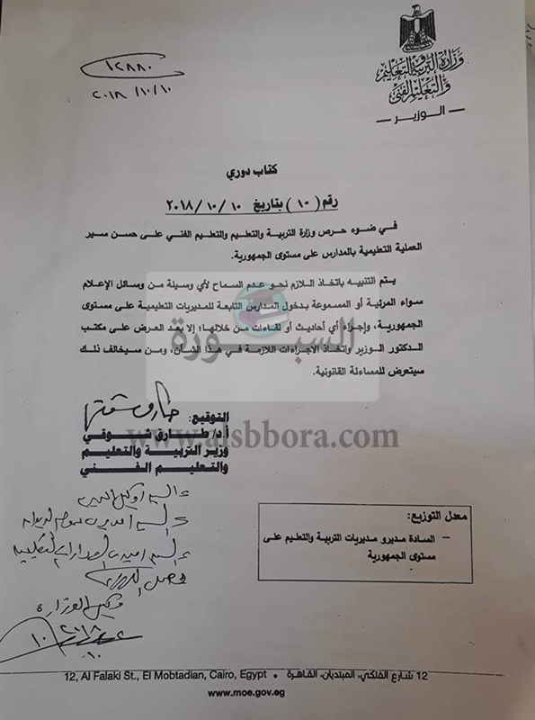وقال الدكتور الوزير فى الكتاب الدورى الذى اصدره انه يتم النتبيه باتخاذ اللازم نحو عدم السماح لاى وسيلة من وسائل الاعلام سواء المرئية او المسموعة بدخول المدارس التابعة للمديريات التعليمية على مستوى الجمهورية واجراء اى احاديث او لقاءات من خلالها الا بعد العرض على مكتب الدكتور الوزير واتخاذ الاجراءات اللازمة فى هذا الشأن، ومن سيخالف ذلك سيتعرض للمساءلة القانونية.