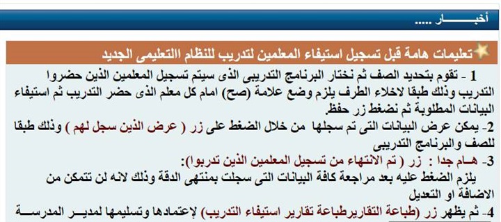 يستعرض موقع السبورة تعليمات هامة الى جميع المعلمين قبل تسجيل استيفاء المعلمين للتدريب للنظام التعليمى الجديد، حيث لا بد من المعلمين ان يقوموا بأربع خطوات والتى جاءت كالتالى: