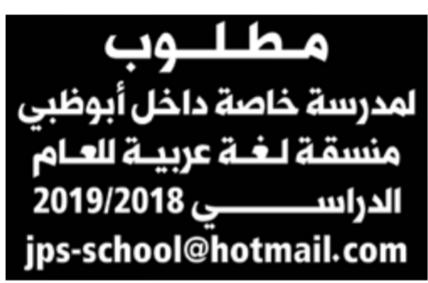 تعلن احدى المدارس الخاصة بامارة ابوظيى بالامارات العربية المتحدة عن حاجتها الى معلمات، وعلى الراغبات فى التقديم ارسال السيرة الذاتية على الايميل المنشور فى الاعلان التالى: