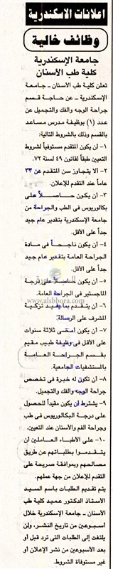 تعلن جامعة الإسكندرية عن وظائف جديدة لأعضاء هيئة التدريس "من معيد إلي أستاذ" وذلك وفقا لنص الإعلان التالي: