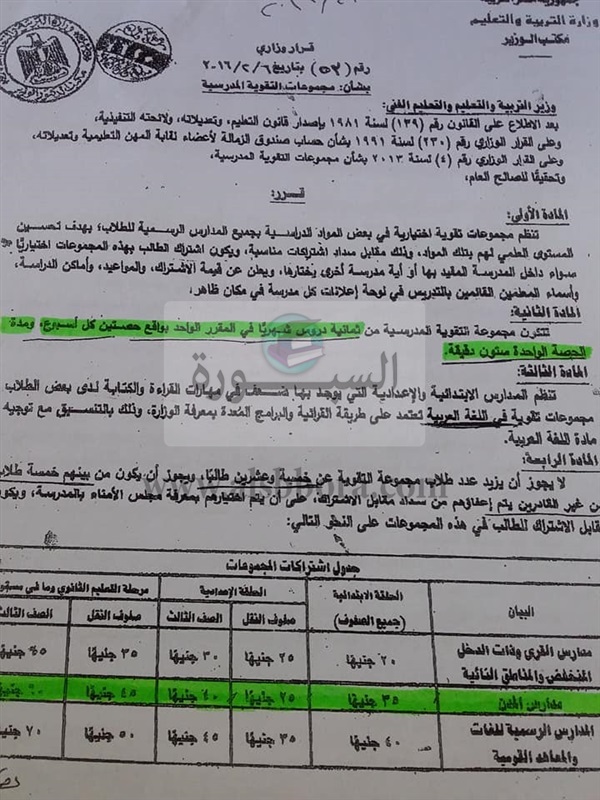 اصدرت وزارة التربية والتعليم قرارا وزاريا بشأن مجموعات التقوية المدرسية ، حيث ارسلت القرار الى جميع المديريات التعليمية، حددت فيه المبلغ الواجب تحصيله من الطلاب الذين يريدون مجموعات تقوية فى جميع المراحل التعليمية "الابتدائية والاعدادية والثانوية".