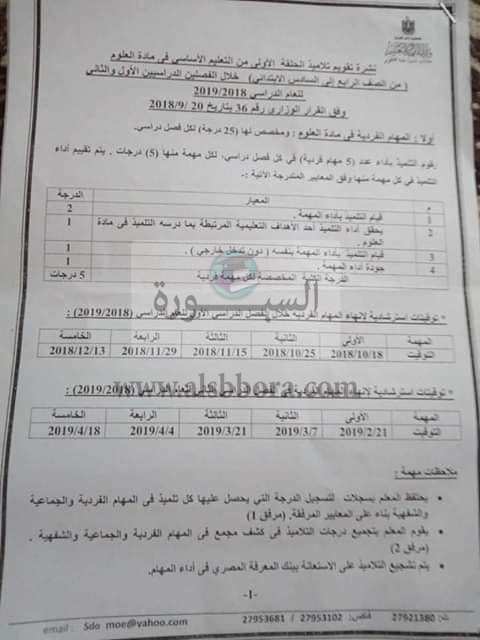 ارسلت وزارة التربية والتعليم والتعليم الفنى نشرة التقويم للطلاب من الصف الرابع الى السادس الابتدائى فى مادة العلوم الى جميع المديريات التعليمية للعام الدراسى 2019/2018، حيث جاء مجموع الدرجات كما يلى: