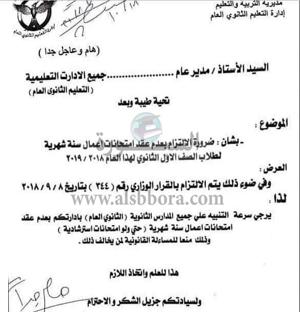 ارسلت وزارة التربية والتعليم والتعليم الفنى، خطابا مهما الى جميع المديريات التعليمية تحذرهم من عقد اى امتحانات شهرية للصف الأول الثانوى العام 2019/2018، ومن يثبت مخالفته لهذه التعليمات سوف يعرض نفسه للمساءلة القانونية من مديرى المدارس على مستوى الجمهورية.