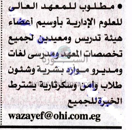 يعلن المعهد العالى للعلوم الادارية بأوسيم عن حاجته الى معيدين واعضاء هيئة التدريس، وعلى الراغبين فى الحصول على الوظيفة ارسال السيرة الذاتية عبر الايميل المنشور فى اهرام اليوم الجمعة الموافق 19 اكتوبر 2018.