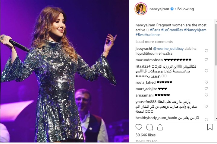 نشرت المطربة اللبنانية نانسى عجرم صور لها على "تويتر" وهى فى شهور حملها الأخير لطفلتها الثالثة وقالت "المرأة الحامل دائما هي المرأة النشيطة".