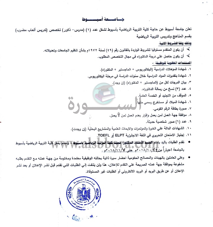 تعلن جامعة اسيوط عن حاجتها الى اعضاء هيئة التدريس، وعلى الراغبين فى التقدم الدخول على موقع الجامعة من هنااااااااااااا.