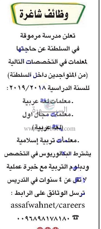 تعلن مدرسة خاصة في سلطنة عمان عن وظائف جديدة للمعلمين والمعلمات وذلك وفقا لنص الإعلان التالي: