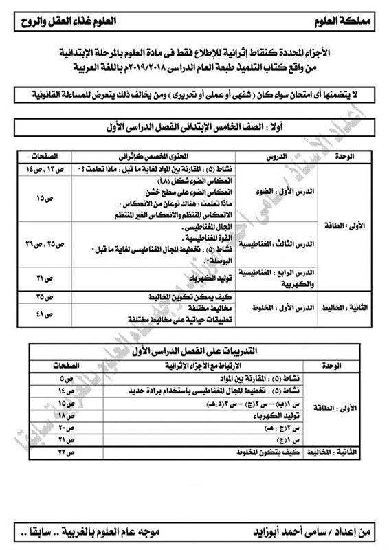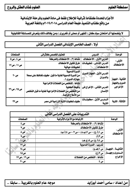 ننشر المحذوفات من مادة العلوم للصف الخامس الابتدائى للعام الدراسى 2019/2018