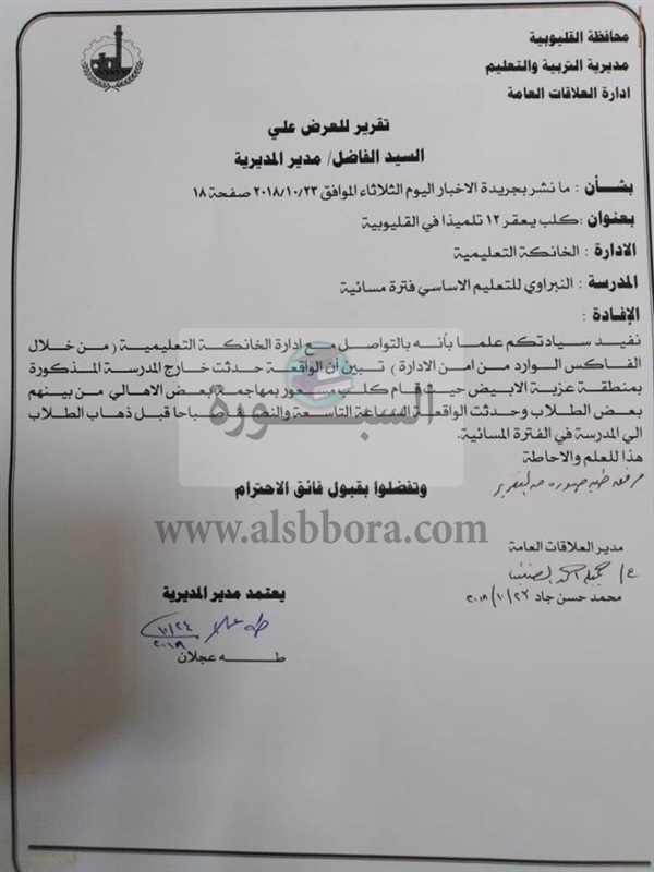 أصدرت مديرية التربية والتعليم بيانا هاما بشأن توضيح تفاصيل واقعة عقر كلب لـ"12 تلميذا" بالقليوبية