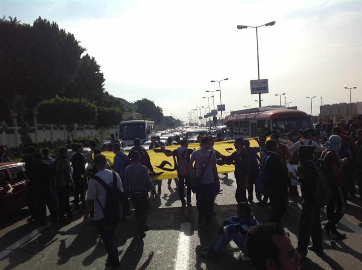 اشعل طلاب الاخوان المسلمين الشماريخ واطارات السيارات بشارع النهضة وقاموا قطع الطريق بمده تزيد عن ساعه وافترشا الارض مرددين هتافات يسقط يسقط حكم العسكر والدخلية بلطجية. و فعت مشادات كلامية بين طلاب الاخوان وسائقي السيارات واعتلا طلاب الإخوان اتوبيسات النقل العام وسيارات المارة رافعين صور الرئيس المعزول محمد مرسي واشارات رابعة